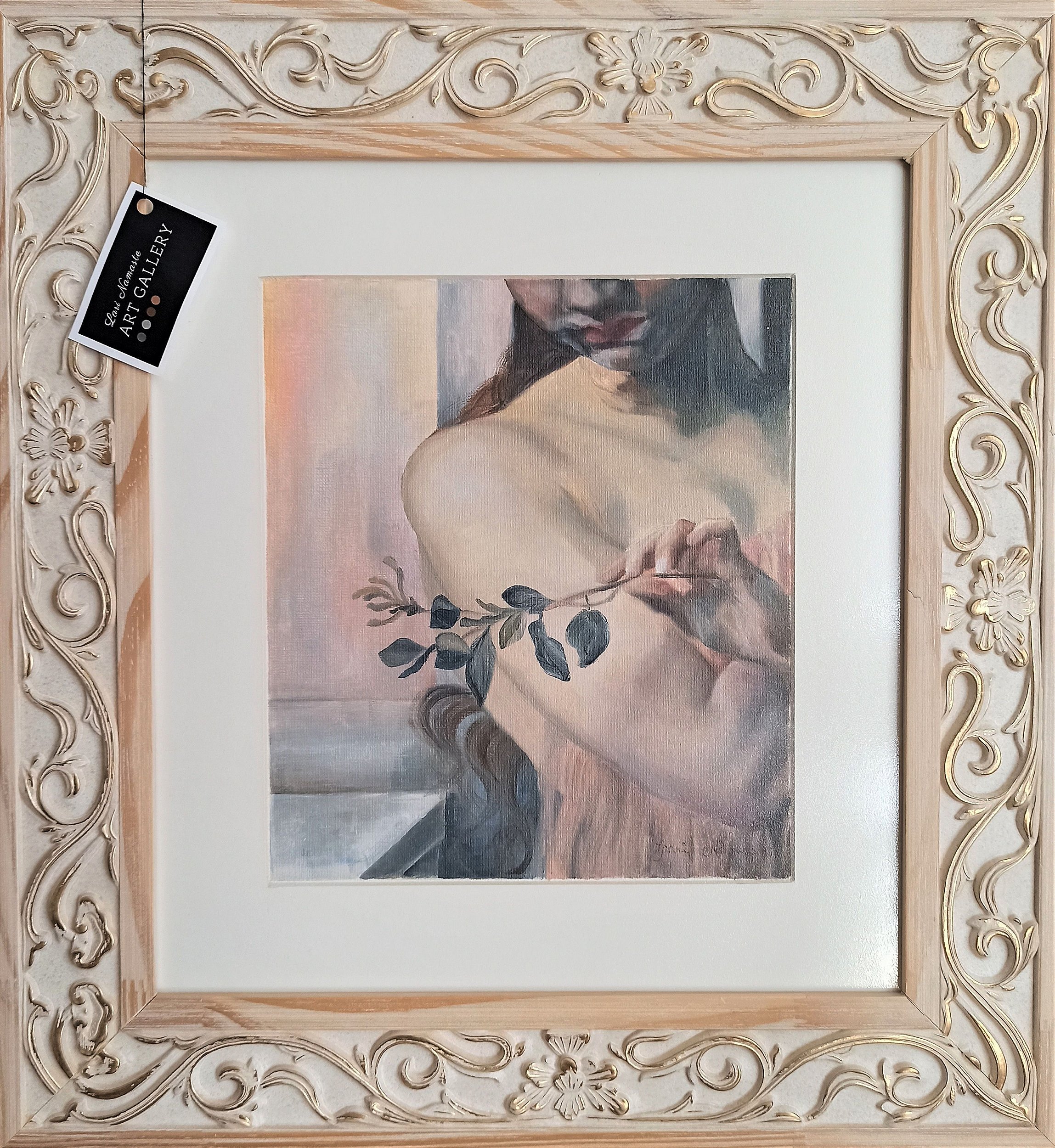 Significado da Obra*: “Instante” revela a beleza infinita da delicadeza de uma planta e sua relação com a figura feminina. Suavidade, beleza, calma, serenidade e contemplação em um único instante. Obra adaptada em forma de releitura da Obra Obra “Psyche in the Temple of Love, do Sir Edward John Poynter (1882).