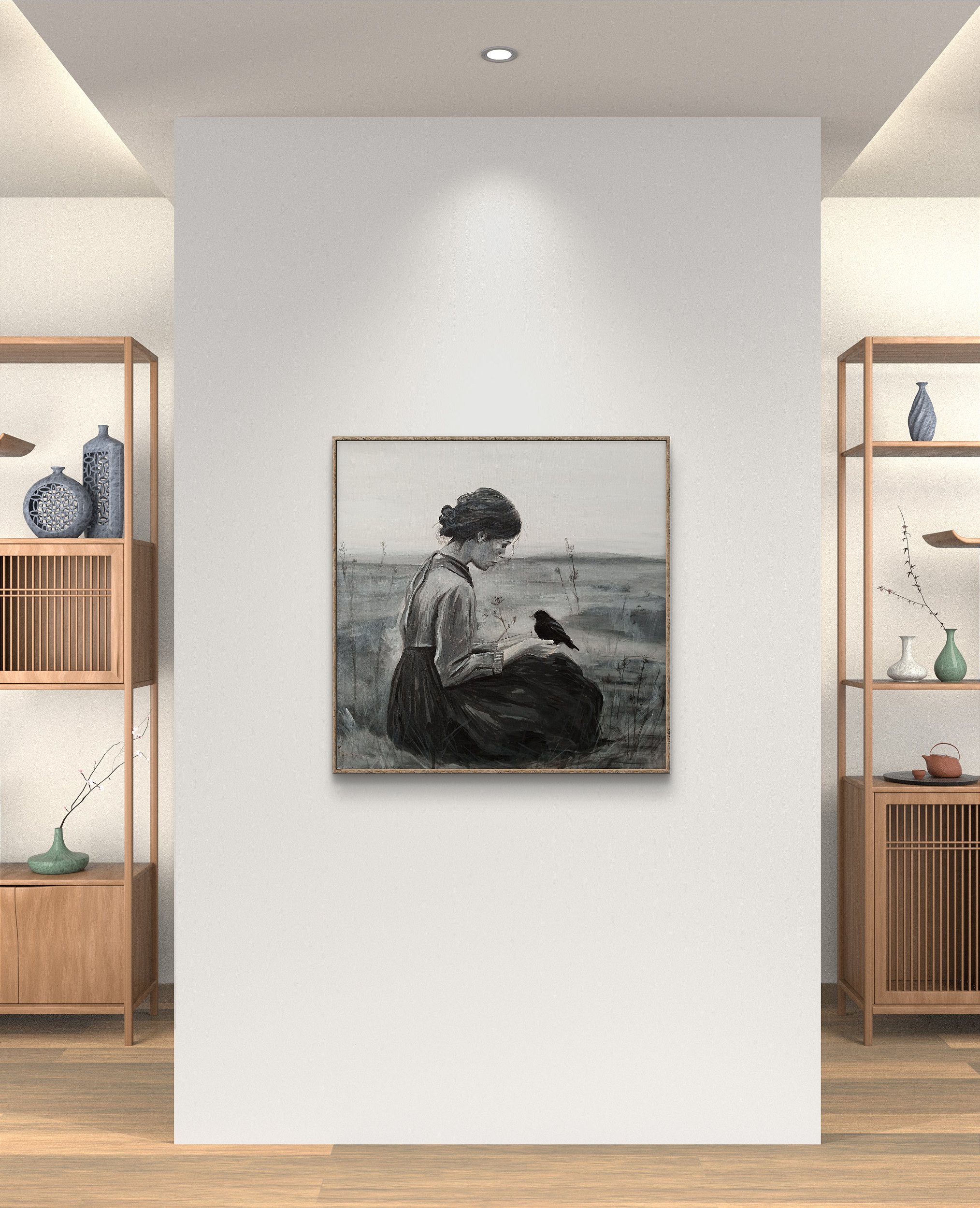 P.S: Obra de Arte vai estruturada (esticada em estrutura de madeira) com acabamento nas laterais, sem a moldura - a moldura da imagem é sugestão de aplicação para o cliente, conforme o ambiente.